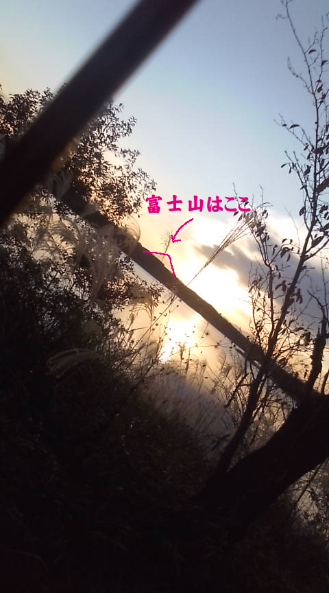 柵の一部のように見える黒い部分(横に走っているところですね)は向こう岸とその向こうの山なんです。だから富士山はその向こうで。